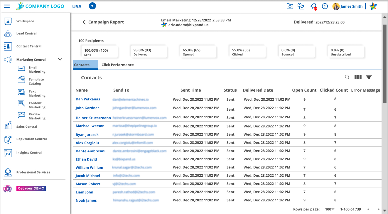 • Reports on Sent, Opened, and Delivered Emails